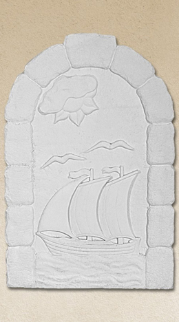 Βρύση από λευκό τσιμέντο με γαλβανιζέ οπλισμό, υαλοΐνες και ειδικά πρόσμεικτα. Προσφέρουμε μεγάλη ποικιλία σχεδίων για αίθρια, κήπους, αυλές και χώρους πρασίνου.
