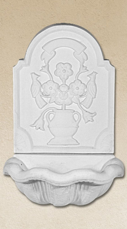 Βρύση από λευκό τσιμέντο με γαλβανιζέ οπλισμό, υαλοΐνες και ειδικά πρόσμεικτα. Προσφέρουμε μεγάλη ποικιλία σχεδίων για αίθρια, κήπους, αυλές και χώρους πρασίνου.